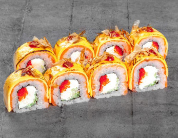 -Рис , нори ,масаго, лосось панировка , чеддер панировка , сыр , украсить соус кисло-сладкий , стружка тунца ( 8 шт )
