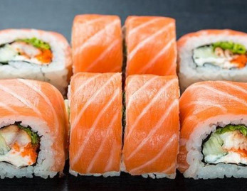 - ролл со сливочным сыром "Креметта", нори, рис,свежий огурец , королевская креветка , тобика икра , панировка лосось ( 8 шт)