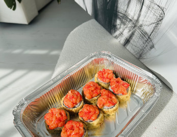 -Рис , Нори , сыр , перец , креветка , тар-тар лосось шапка , спайси соус ,масага ( 8 шт )