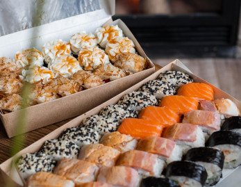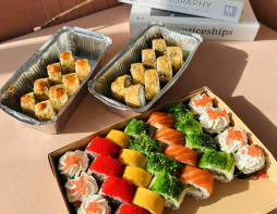 -Рис, Нори, Сыр,Панировка половина ролла Лосось свежий, Панировка половина ролла окунь свежий,спайси соус ( 8 шт)