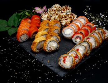 Ролл Футояма: рис, нори, лосось терияки, перец, огурец, сыр, кунжут белый.