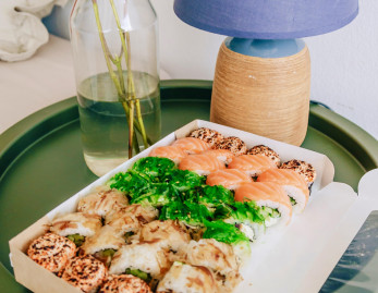 Ролл Вакаме Терияки: рис, нори, сыр, лосось Терияки , такуан, чука-салат.